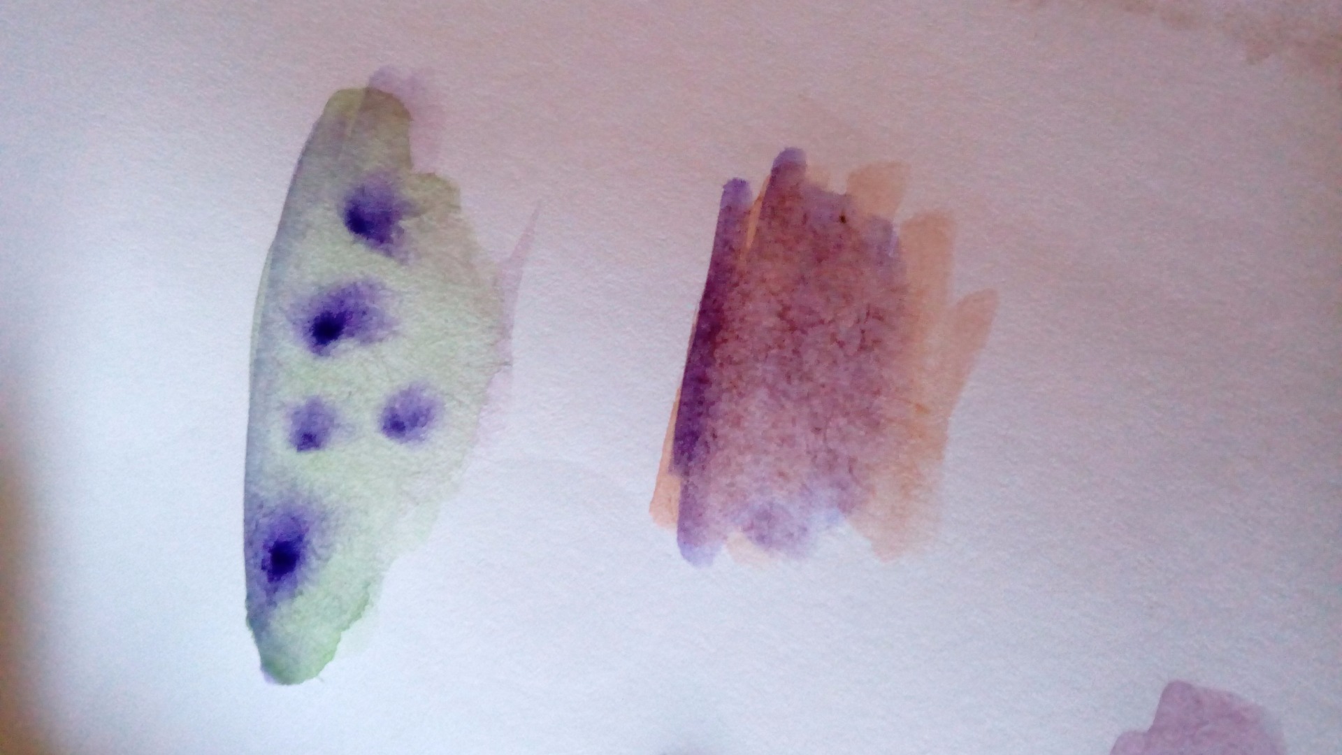 Para hacer los efectos/texturas, suelo mezclar como en la imagen, la primera mancha. Que consiste el una base con mucha agua y luego el otro color, al echar el segundo color, me gusta hacerlo en puntitos.